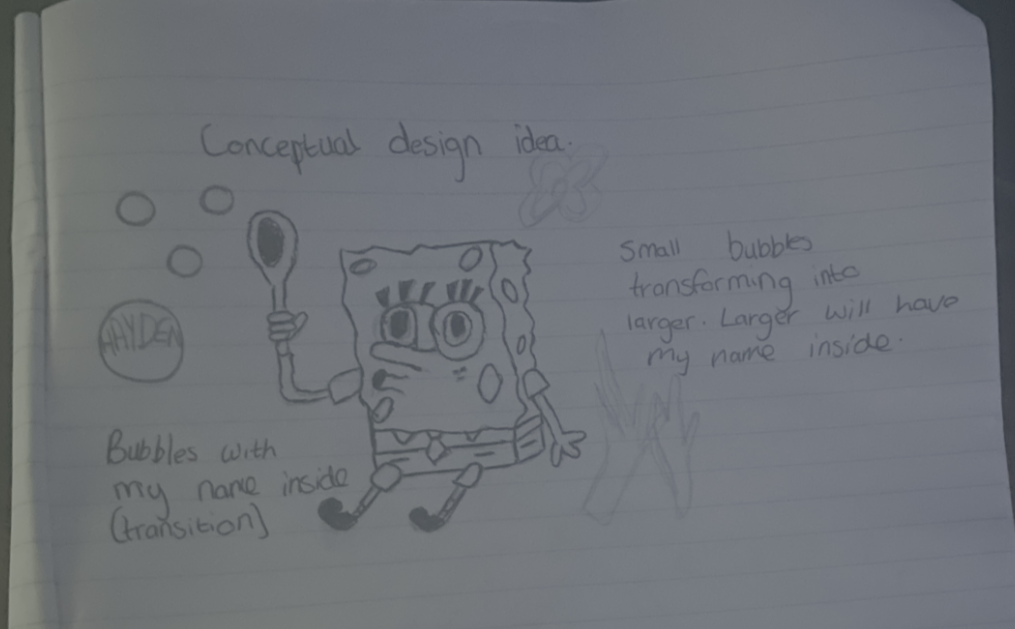 When designing my work, I landed on a “SpongeBob” type scenario which in some situation can include my name in the piece, to do this I had attempted sketches all in a form which still portrays my idea, the design I landed on included SpongeBob blowing bubbles with gradually transitioned into my name. The bubble idea worked as I intended due to blowing bubbles being a large factor within the episodes.