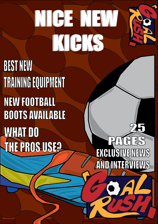 As this magazine issue was to be based around boots instead of the players I opted to create a design which displays a ball and a boot alongside each other, the colour scheme I chose helps to make the boot stand out and be more eye catching for the children who may see the cover. The colour scheme and design for the background, the idea came from the boot as most of the colour that appears is an orange, so implementing a dark orange background causes all of the design to fit in nicely together.