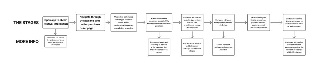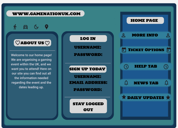 My low fidelity layout has been made through the use of fig jam, and every part of this design each has its own explanation to why and how customers can be happy with this layout and style if they was to see this when using the companion app for my event. The layout size and style I have chosen is how this would appear on a tablet or iPad for example. The layout itself is consistent and as a home landing page has everything that the customer needs to understand the event and how they can move forward. All content can be see clearly and mapped out in an organised fashion on the right side of the layout, not in the way of any additional features and information.