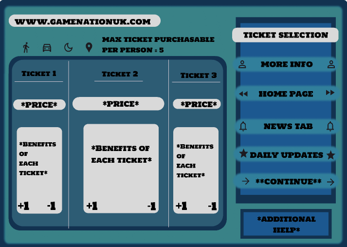 The ticket page is intended t be the other main part of the app as this is the first stage to getting into the event, yet again this is mapped out in a fashion which isn’t too confusing for the user and follows a consistent format to the landing page. Key information is placed around the page such as the ticket limit with features such as the “+1” and “-1” buttons to add or remove tickets also being placed in a visible location. If the user requires any additional information a button is placed in the bottom to aid them with any other questions they may have.