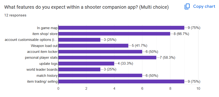 I have been chosen to create both a companion app and a website based on a shooter game named Eco blast, the game is a online multiplayer game were each gun and bullet provide elemental effects, this game is my idea and not something already available. The purpose of this companion app is to help improve the experience and overall reaction to the online shooter game, “Eco Blast”. This has been done by offering tools that are noted as missing within other gaming companion apps. Features such as trading menus, customisable weapon loadouts, in game maps and match history are all included. My app will is inspired by feedback I’ve found by researching within gaming communities and has been designed to meet the needs of both casual and competitive players. Additionally I gained input from people in this community, for a better understanding, through the use of google forms, these forms shared through reddit and discord. This helps to gain an input into what the potential users expect and want within a companion app. The main target audience for this app will be those over 16, as the game features guns which can be seen as a mature theme. Whilst studies from 2024 show, 35-44 years old is the largest demographic of people playing shooter games, with 80% of men preferring shooters over any genre. Meaning my ideal target audience ranges from males 18-44 years old.