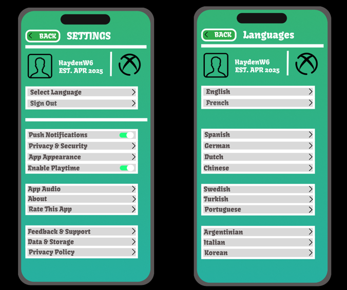 All key areas had the same amount of time allocated, however I made sure to focus and spend more time on the settings tab found within the home screen. Implementing a well planned settings menu is key as this provides the user with some important accessibility features, helping towards making the app more personalised for each player.