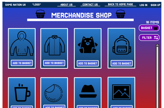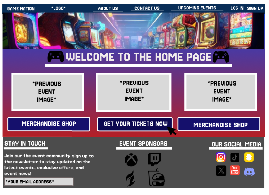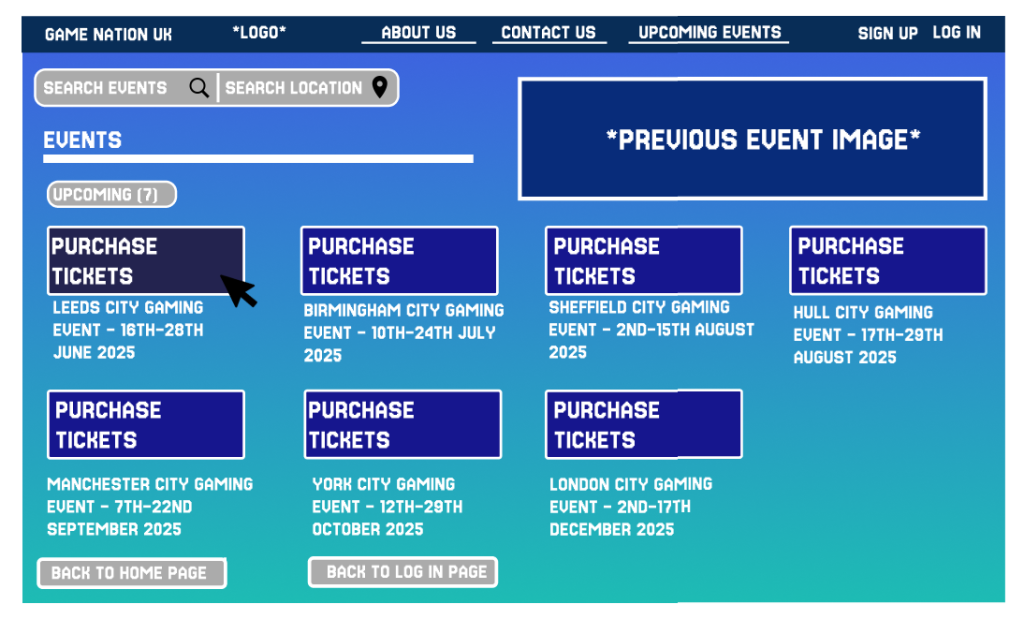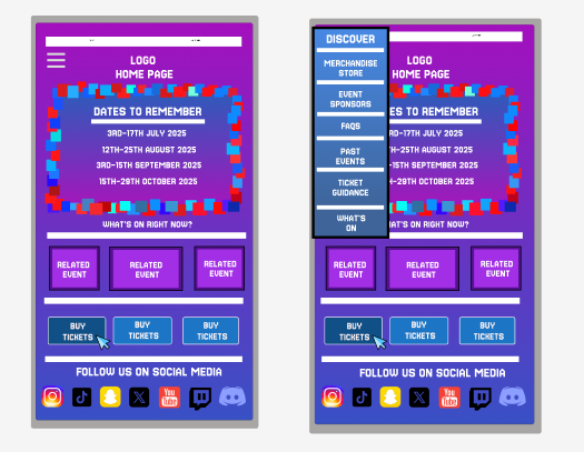 When the customer opens up the events web page, they are met with a large range of buttons which all posses a different page. To be consistent between both app and web page, selected buttons appear in a dimmed version compared to the rest. With all the menus within the top bar being used for transportation to other pages.