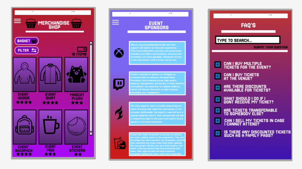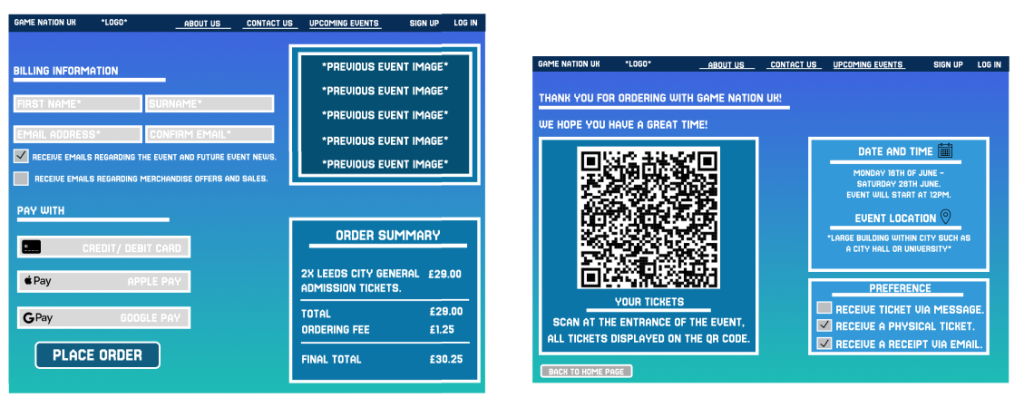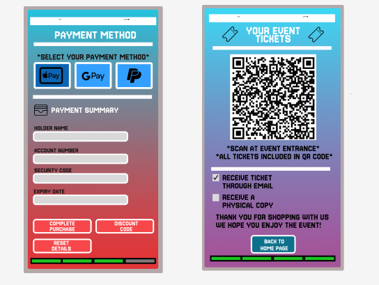 The last set of responsive features can be found during the final stages as the user chooses their payment method, with their selection being a different and darker shade colour. On the ticket page, two preference questions are available, implemented to improve the user customisation and response.