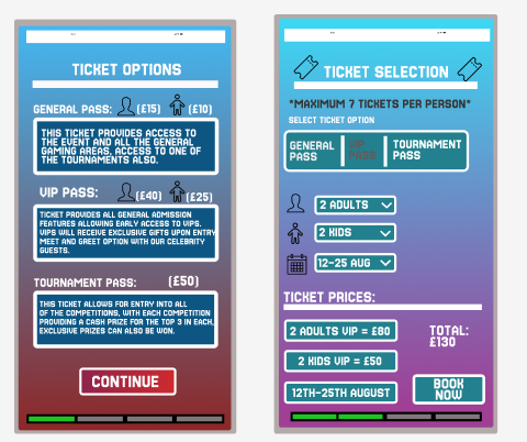 When the user click the purchase ticket button, they are transported to a page which displays the different ticket types that are currently available. Clicking “continue” will allow for the customer to customise their event selection. Users can chose the ticket amount and the day they wish to attend, allowing for a more responsive design. Ticket pricing is placed at the bottom to help inform the users on their ticket price. A progress bar is included to help guide the user through their purchase.
