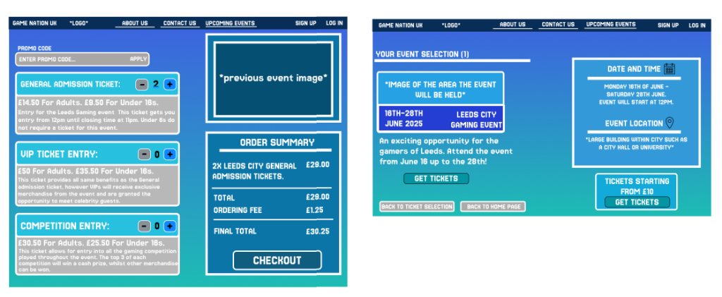 The ticket page allows for more of a responsive design, as users can add or minus a selected ticket and have the option to choose between the three different ticket options. The order summary is important as it helps the user to understand how much the total price is, adding towards a quick and efficient experience.