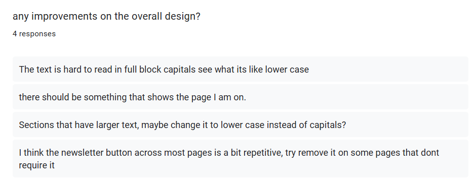 After completing the design and layout for each page, I used a google form to collected feedback from friends and peers to understand how the sites usability and experience could be improved. A recurring point of feedback talked about the use of full block capitals in larger sections of text. Two people commented about how the capital letters made the paragraphs harder to read and felt visually difficult on the page. I tested their suggestion by switching these sections to lowercase, and it immediately improved readability. Because of these responses, I updated all longer text blocks to lowercase, which made the content more approachable and reduced the strain on the user when scrolling through information.
