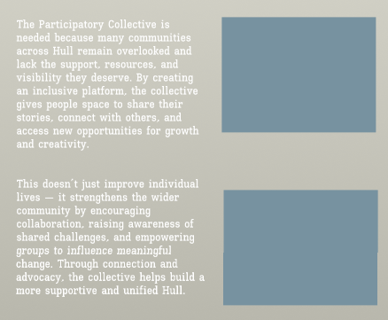 As a reminder about the project, the Collective was created to bring together both physical and virtual communities across Hull and offer a space where collaboration, creativity and a positive change can be made throughout. The organisation focuses on supporting the smaller community groups who often go unnoticed or lack the funding and resources they need to therefore be successful. By providing these groups with a platform, the Collective aims to enlarge and amplify their voices, share their experiences and help to build pathways toward better support and long term opportunities. The overall goal is to strengthen these communities, increase visibility, and encourage contributions which will and can influence change across the city.