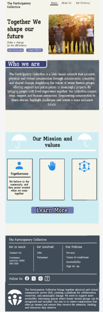 The “about us” page is accessible to users from the start, this appears as one of the first buttons the user can interact with. This gives them the option to explore a more detailed explanation of the Collective and its purpose. From this point onwards, the users can learn about the organisation’s aims, the partners involved, and the overall impact of their work. When designing this page, I kept the same structural choices that I used when designing the homepage. This includes placing a Call to Action at the top as the first interactive element, and keeping the text and images centred to create white space, which helps to prevent the layout from feeling overcrowded. The aim was to maintain consistency while ensuring the page remains clear, welcoming, and easy to read.