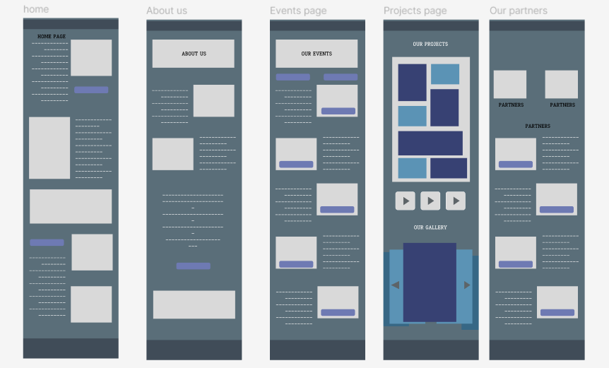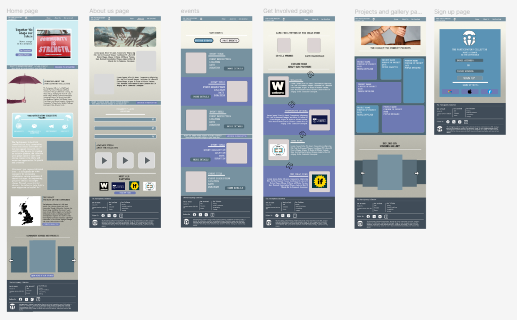 All my main mid fidelity pages featuring the home page, about us, events page, get involved page, projects and the sign up page.