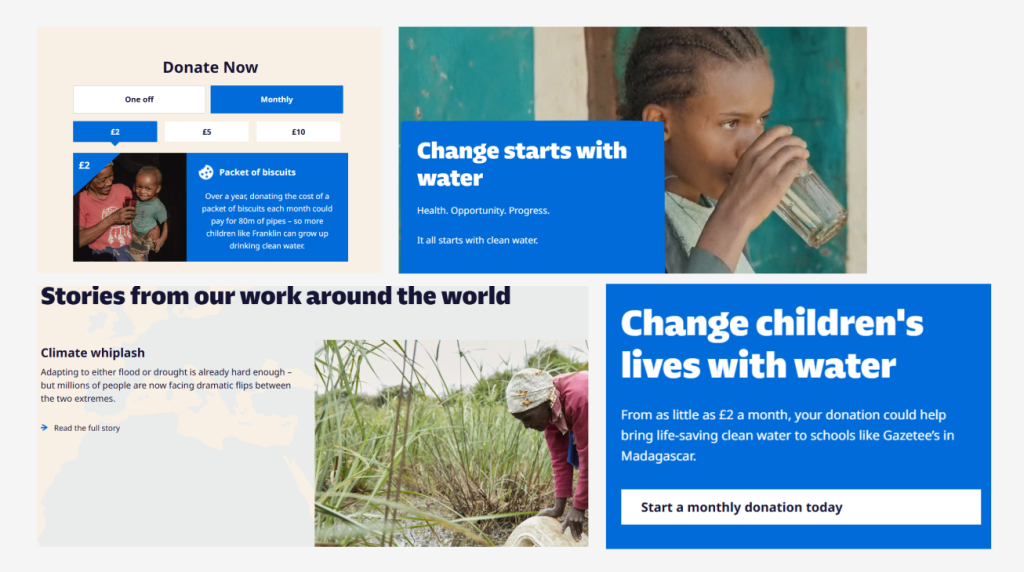 The final organisation I reviewed for design inspiration was WaterAid, the focus on human needs is reflected throughout the charity’s website design and visual branding. The overall design and layout across the website is clean and simple, which helps to remind the users of the charities mission, reenforcing the ideas of purity, health, and a clean hygiene. The colour scheme consists of white and different shades of blue, which displays the association with water and cleanliness. These colours have been used strategically to guide the user’s attention and to remind the user about the water aid brand identity. Darker shades of blue are used for the for call-to-action buttons. Helping them to stand out clearly without appearing to distracting. The choice of colour scheme makes sure that navigation remains easy and accessible, whilst still encouraging users to engage with the site’s content. The images on the site act as a key role and message in communicating WaterAid’s importance. The images used across the website include people in the local communities gaining access to clean water and participating in other health related projects. These images add a sense of authenticity, and a reminder to the user about impact of their support. The images showcase the work and improvements that water aid have achieved, whilst still reminding the user about the charities mission. The water aid design choices are a great example on showing that good design choices helps to effectively communicate the. key ideas and values