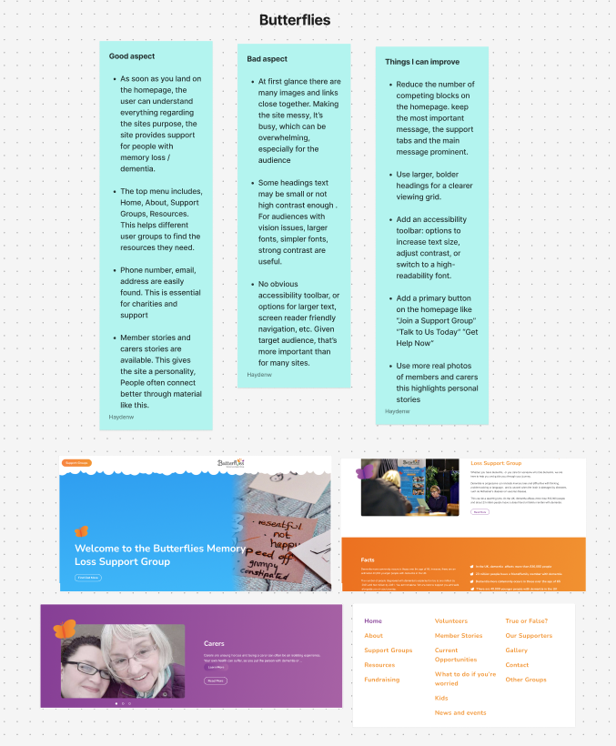 The first community group I researched that are partnered with the Participatory Collective was Butterflies, an organisation that supports people affected by dementia, which included those living with the condition, carers, and individuals who may be showing early signs of dementia. The website’s homepage is designed for easy navigation which is beneficial for users who may experience confusion. The butterflies webpage layout helps to makes it easier for visitors to find resources and extra support they may require. The web page layout helps to create an inclusive and welcoming environment across the site. One feature which I thought was important to include was the members Stories section, this adds a personality to the site and creates an early on connection between the community and the users. The overall design of the site is simple and consistent, using a mainly white background with light accent colours, with the addition of occasional images. However, one area on the butterflies site that I think needs improvement, is the amount of content displayed on the homepage. At first glance it feels slightly overwhelming, which could be challenging for users, especially those with dementia when navigating. Simplifying the content and breaking it into smaller sections could help improve the user experience and overall accessibility.