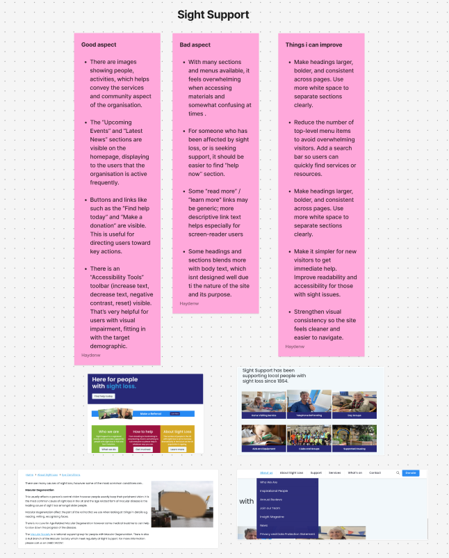 The second community group I researched was Sight Support, sight support that offers assistance and support to individuals which are experiencing sight loss or early signs of visual impairment. One of the strongest aspects of the Sight Support website is the attention to detail and the overall priority of accessibility. The accessibility toolbar allows users to adjust the text and image sizes, the website also allows the user to choose from a range of colour schemes and options. These features are especially valuable for the sight support target audience, supporting those with visual difficulties, allowing them to easily navigate and access the content. Another positive and strength of the website is the “upcoming Events page”, this section shows that the organisation is active but also provides the community aspect community by encouraging new and returning members to connect with others also dealing with visual impairments. Offering both inclusivity and the community aspect, two important values to the participatory collective. Regarding the design, the site follows a simple approach, by using a white background with darker colours used for borders and dividers. The design may appear as plain, but I believe that the simplicity is appropriate and needed, given the audience’s needs, helping to avoid visual strain. However, one possible improvement that could be done, is the addition of a faster navigation feature, such as a search bar included into the accessibility toolbar. This would make finding specific material more efficient, enhancing the overall user experience.