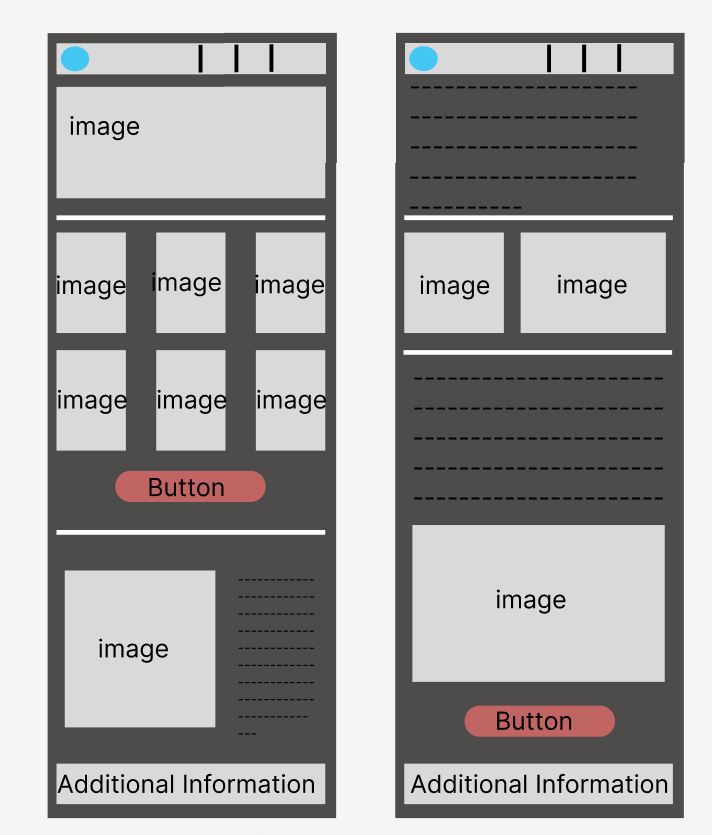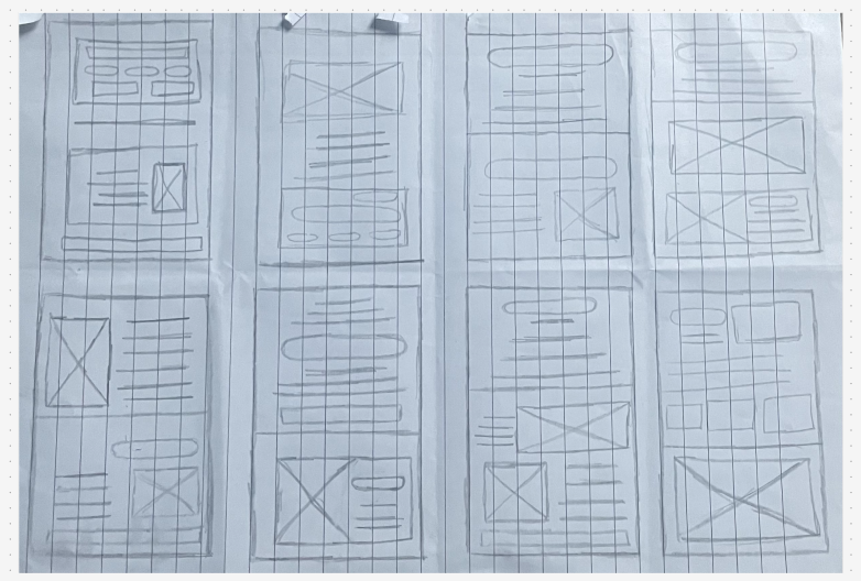 For making a layout, I developed eight different layout styles on paper, with each being drawn under one minute. All eight of these layouts consist of the same items such as buttons, text and images just in a variety of different formats, which can then give me an early start on making my layout using figma. With one bigger and more detailed sketch also being created.