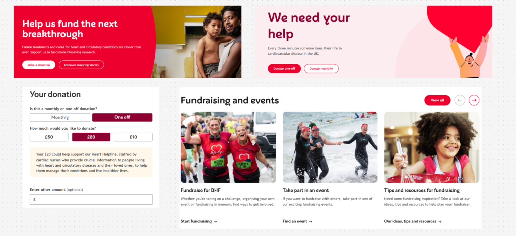 The second non-profit organisation I chose to research was the British Heart Foundation. The organisation focuses on offering treatment, research and funding, whilst also providing emotional support for those who may need it. When reviewing the website, the homepage immediately stands out due to the informative layout and design something which can inspire me. The call to action buttons are bold, visible, and strategically placed to encourage user to interact as soon as they open the website. The design scheme consists of a strong brand consistency and identity, using a red and white colour scheme that links in with the organisation’s logo, it helps to displays the care and trust within the charity. The use of white space is effective as this allows the uses attention to always be focusing on the key elements such as imagery, text and calls to action. This creates a clean and accessible layout which helps to communicates the British Heart Foundations message whilst guiding users towards engagement.