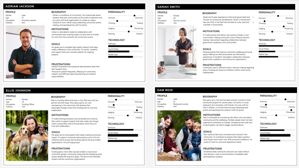 user personas based on Funders, Community member, Policy maker and Academic.