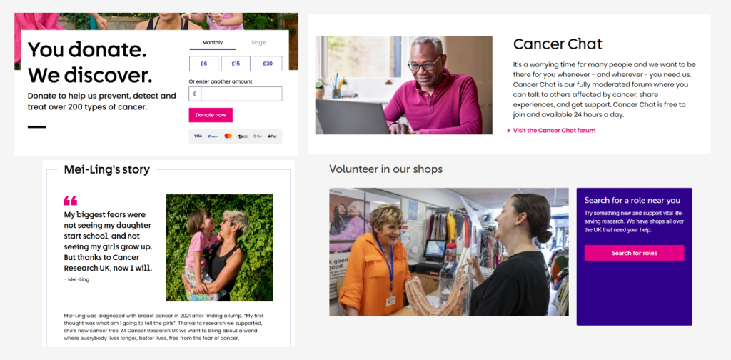 The first non profit campaign website I researched for design inspiration and layout ideas was Cancer Research UK, a charity dedicated to supporting those affected by cancer. My review focused on both the design choices and accessibility of the site. The brand maintains a consistent and recognisable visual identity throughout, using a range of pinks, purples, and blues with the rest of the site being filled by white space which I liked and worked well across the website. The use of these colours creates a clean, professional, and welcoming impression, linking in with the charity’s mission of care and support. The consistent use of these colours creates brand recognition but also helps to create a sense of trustworthiness, which is one of the most important qualities for a charity. The pink tones also has connections to Breast Cancer UK, reinforcing the visual identity and recognition. Most of the imagery features volunteers, researchers, and people impacted by cancer, this helps to add a sense of authenticity and connection to the site. Focusing on the community side and to highlight all the important work the charity has done. Another strong design feature is the calls to action throughout the site. Buttons encouraging users to “donate” “get involved” and “learn more” are always visible, providing opportunities for engagement at all times. This helps to keep the audience connected whilst also guiding them towards being involved in everything the charity does. Overall, the Cancer Research website showcases how a strong visuals and clear communication can result in a site that is both engaging and effective.