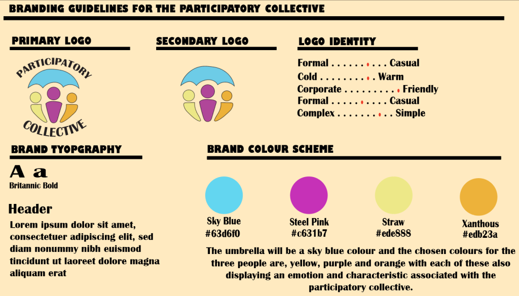 Each of the colours chosen within my logo have their own meaning and displayed emotion relating to the participatory collective, I’ve used a light shade of blue on the umbrella to represent the trust and calmness, representing the protectiveness and welcoming aspect of the collective. The chosen colours for the three people are, yellow, purple and orange with each of these also displaying an emotion and characteristic associated with the participatory collective. When doing my research, I found out that purple is an annotation for both creativity and respect, displaying the importance of creative collaboration within the collective and the overall respect shared between its members. Yellow is the colour used to show optimism, joy and positivity it shines light into both the logo and representing the participatory collective, a sign that members should feel happy and optimistic about the future and making a positive change. The final colour to finish the logo is orange, orange was chosen as this colour represents both warmth and welcoming, the collective aims to be welcoming to all members as this is one of the stages in gaining that trust between communities and collectives. All these colours had been carefully chosen for these reasons and not just due to the logo looking visually pleasing.